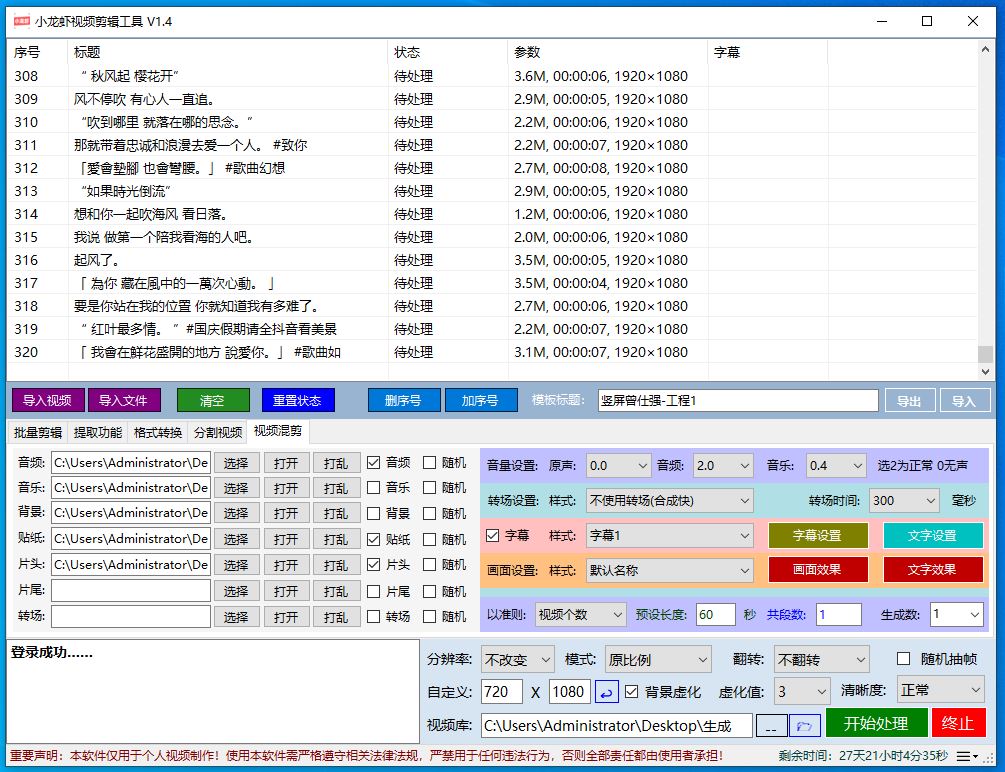在后期处理方面,小龙虾剪辑助手支持 自动字幕生成、手动字幕制作、字幕添加、文字叠加、去水印与加水印、画中画、视频翻转、智能分割、视频去重、特效嵌入、背景音乐处理、智能配音、文案提取 等实用功能,满足从素材处理到成片输出的完整流程。